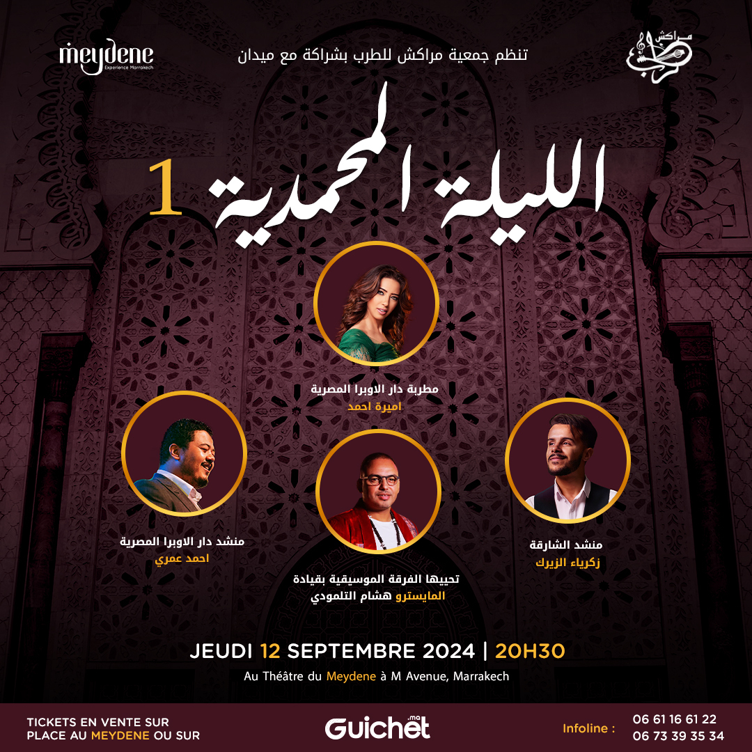À l’occasion du Mawlid Al-Nabawi, deux soirées spéciales, les 12 et 13 septembre, inviteront le public à plonger dans les louanges et les chants religieux, sublimés par des voix venues du Maroc et d’Égypte. Le Théâtre Meydene, en partenariat avec l’Association de Marrakech Tarab, a réuni pour l’occasion des artistes d’exception. Accompagnés par le maestro Moulay Hicham Talmouti, Zakaria Al-Zirk, lauréat de l’émission Munshid Al Sharjah 2022, ils représenteront fièrement le Maroc aux côtés des chanteurs de l’Opéra du Caire, Amira Ahmed et Ahmed Al-Omari.