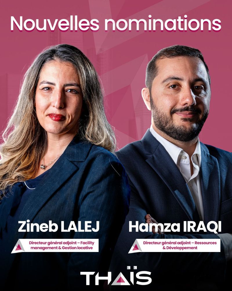 THAÏS, entité du groupe Ténor, renforce son organisation avec deux nominations à la direction générale. Zineb Lalej est nommée Directrice générale adjointe en charge du facility management et de la gestion locative, tandis que Hamza Iraqi prend les fonctions de Directeur général adjoint en charge des ressources et du développement.